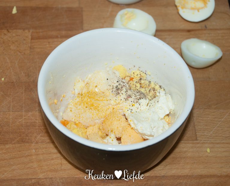 Snijd aan de bovenkant circa 1/3 van het ei af (het kapje) en snijd een klein stukje van de onderkant af, zodat het ei makkelijk rechtop blijft staan. Hol het ei voorzichtig uit. Prak het eigeel fijn en meng met de mayonaise, crème fraîche, kerriepoeder en breng op smaak met zout en peper.