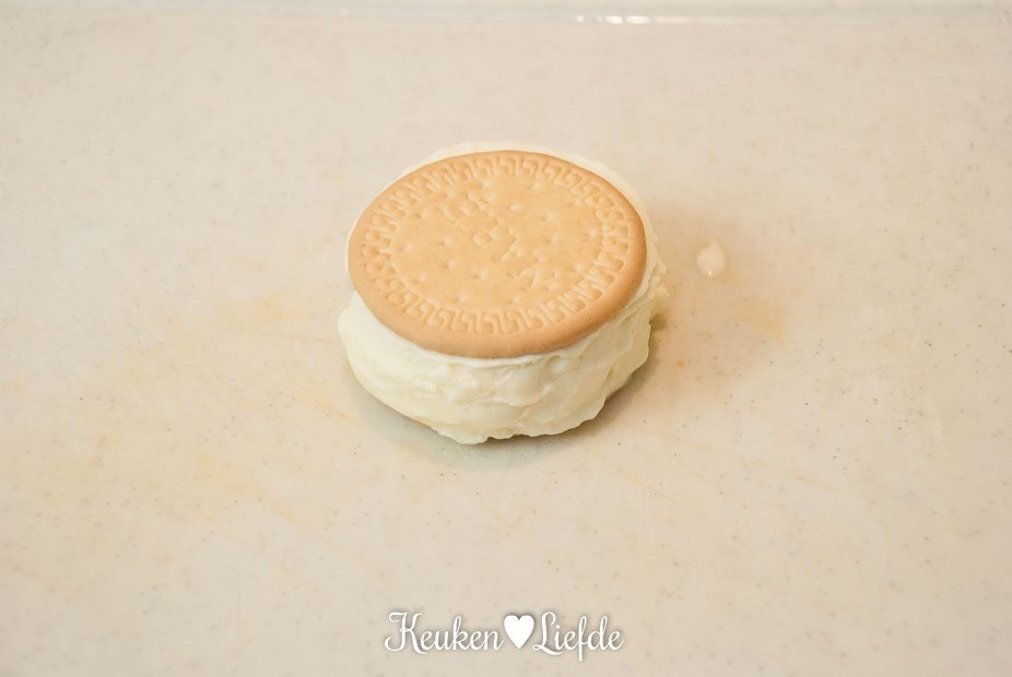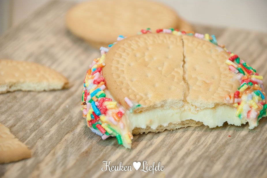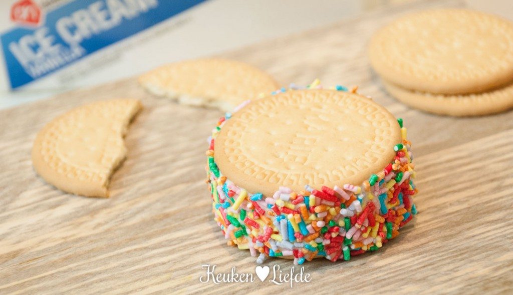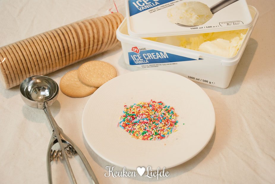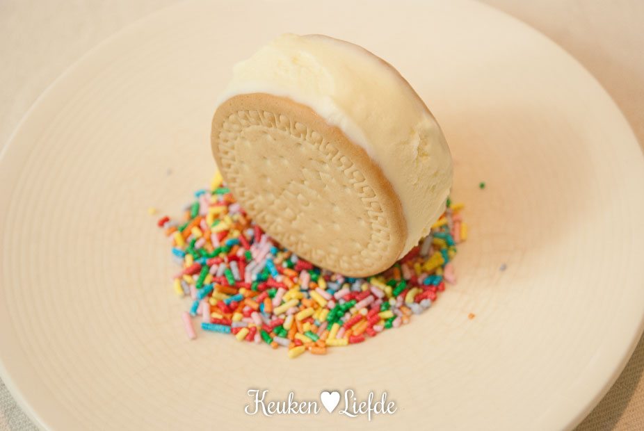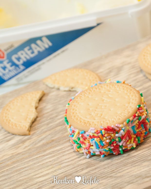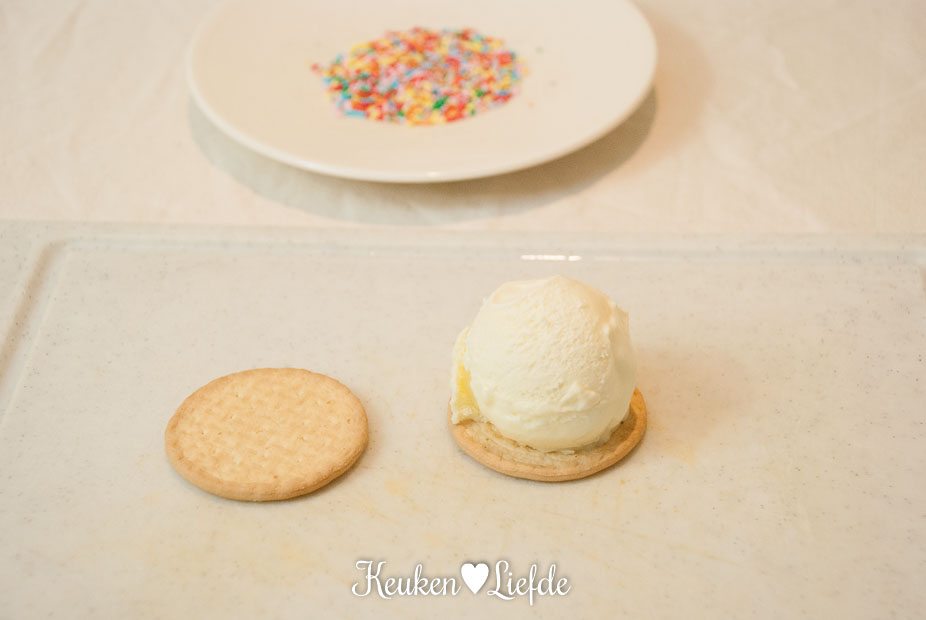 Schep een flinke bol vanilleijs op een koekje en druk het andere koekje erbovenop. Druk iets aan zodat de koekjes tot aan de rand volledig zijn gevuld met ijs. Snijd het overtollige ijs rondom weg met een mes. Leg het koekje 15 minuten in de diepvries, zodat het ijs weer hard wordt. Leg de spinkles op een bordje en rol de zijkanten van het koekje door de sprinkles.