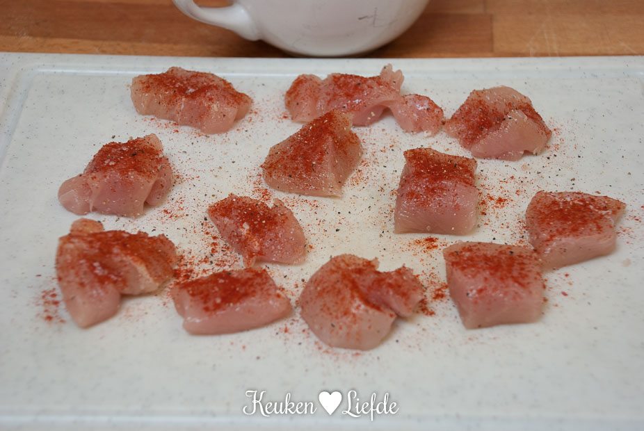- 1 scharrelkipfilet, in middelgrote blokjes gesneden