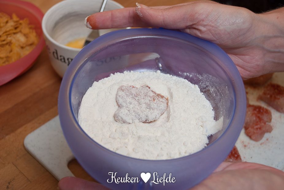 Bestrooi de kipfiletblokjes royaal met paprikapoeder, zout en peper. Zet drie bakjes klaar met bloem, ei en cornflakes. Wentel de kip één voor één door de bloem, ei en cornflakes en leg ze op een met bakpapier bekleed bakblik. Bak ze 10 minuten in de oven, of totdat de kip gaar is.
