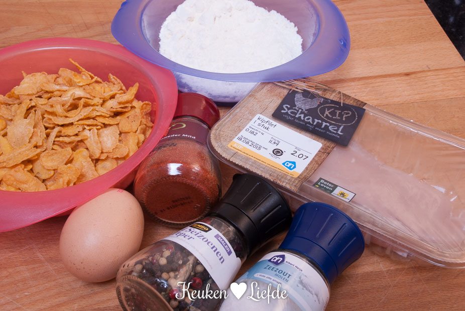 Om mijn kleine aap niet teleur te stellen, ben ik vrolijk aan de slag gegaan. Ik paneerde een blije scharrelkip met wat krokante cornflakes en bakte de schat gaar en krokant in de oven. Boter en olie zijn op deze manier overbodig, wat de kippetjes nóg gezonder maakt.
