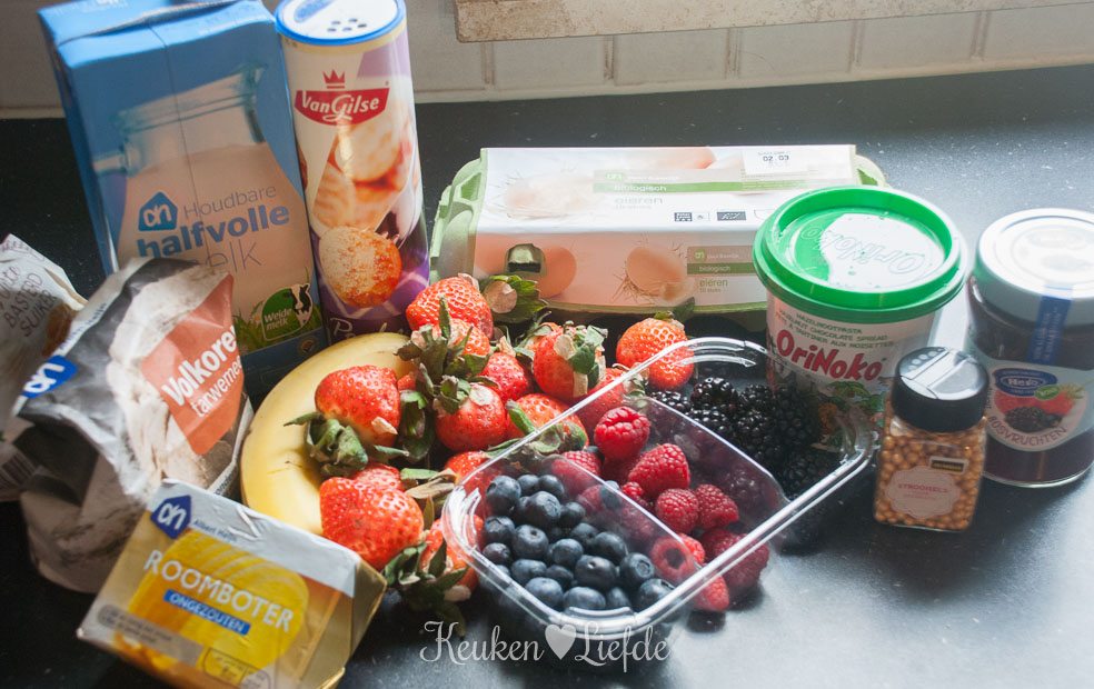 - 1x recept voor pannenkoeken, (vervang de bloem eventueel door volkorenbloem, dit is wel minder lekker dan gewone bloem)