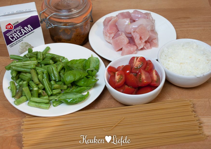 Verhit ondertussen een koekenpan met wat olie, bestrooi de kip met zout en peper en bak op hoog vuur goudbruin. Voeg, als de kip bijna gaar is, de pesto, slagroom en een handje Parmezaan (houd wat achter voor garnering) toe. Roer door en laat de saus inkoken, totdat hij iets dikker wordt. Breng op smaak met zout en peper en houd warm op laag vuur. Giet de spaghetti en sperziebonen af, vang een kopje kookvocht op van de spaghetti. Doe de spaghetti en sperziebonen weer terug in de pan samen met het kopje kookvocht, de tomaten, basilicum en de kip in pestosaus.