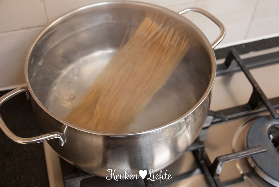 Kook de spaghetti en sperziebonen gaar volgens de bereiding op het pak. (Ik kook de spaghetti en sperziebonen tegelijk bij elkaar in dezelfde pan, dat scheelt afwas.)