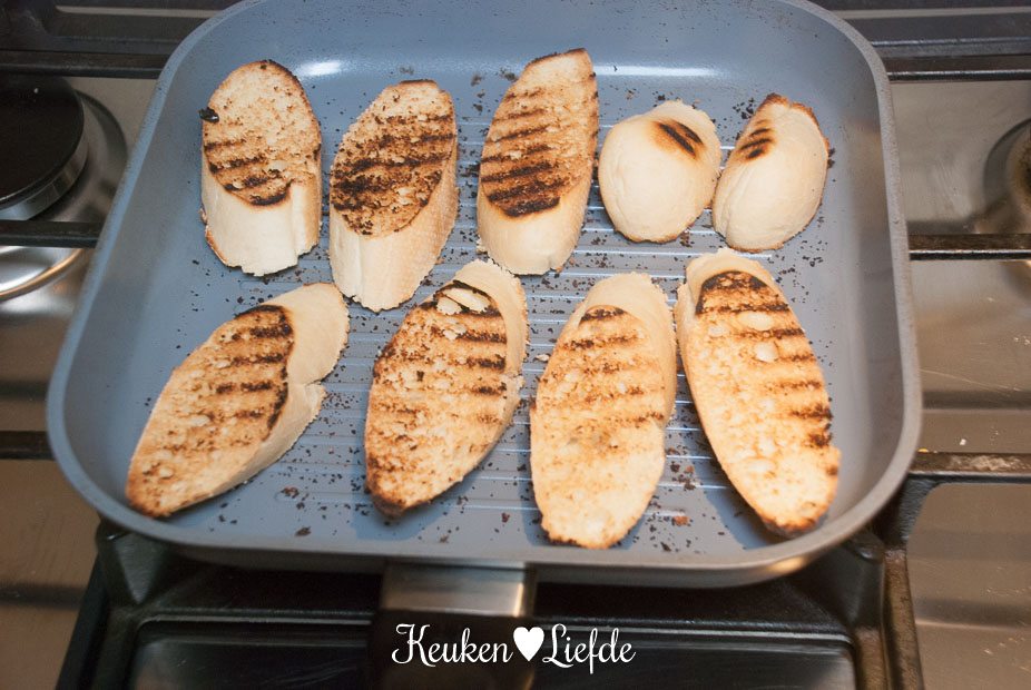 Snijd het brood in middeldikke plakken en rooster ze onder de ovengrill, of in een hete grillpan, totdat ze goudbruin, en knapperig zijn.