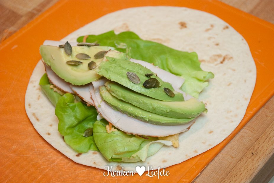 Leg het blaadje kropsla op de wrap en beleg met de overige ingrediënten.