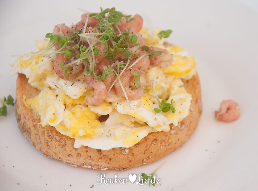 Speltbeschuit met roerei, Hollandse garnalen en tuinkers