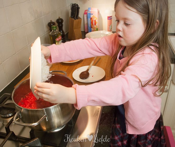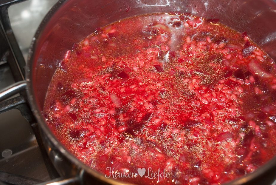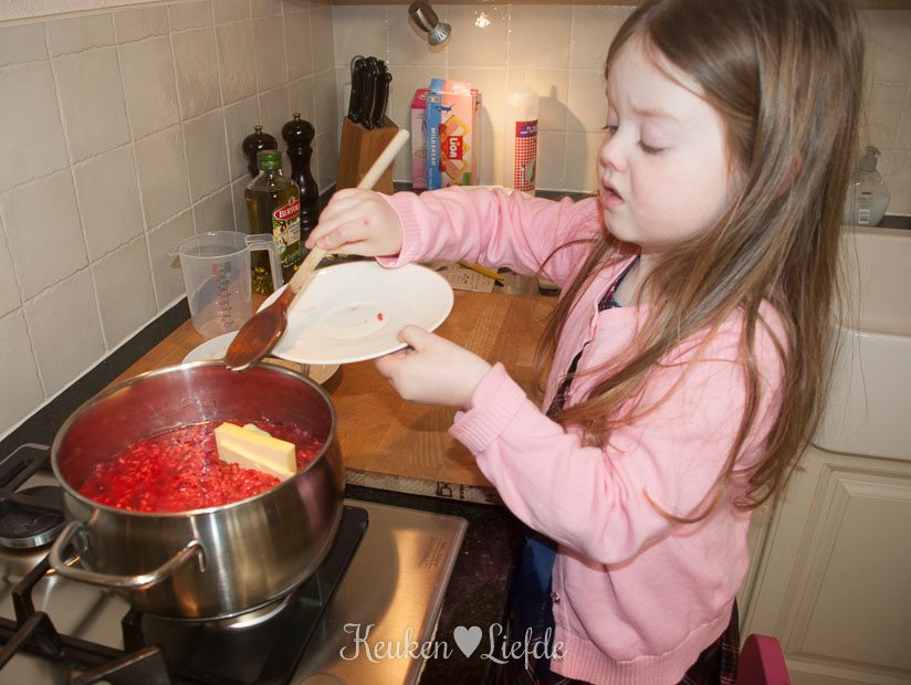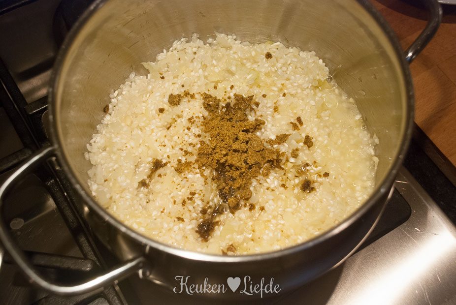 Verkruimel de bouillontabletten over de risotto en voeg zoveel water toe totdat de risotto net onder staat. Roer even door, voeg de bietjes toe (mijn bietjes waren nog vrij hard, dus voegde ik ze al direct toe om verder te laten garen) en laat op laag vuur zachtjes pruttelen. Voeg steeds opnieuw wat water toe als het vorige bijna is opgenomen (de risotto mag niet te droog worden!).