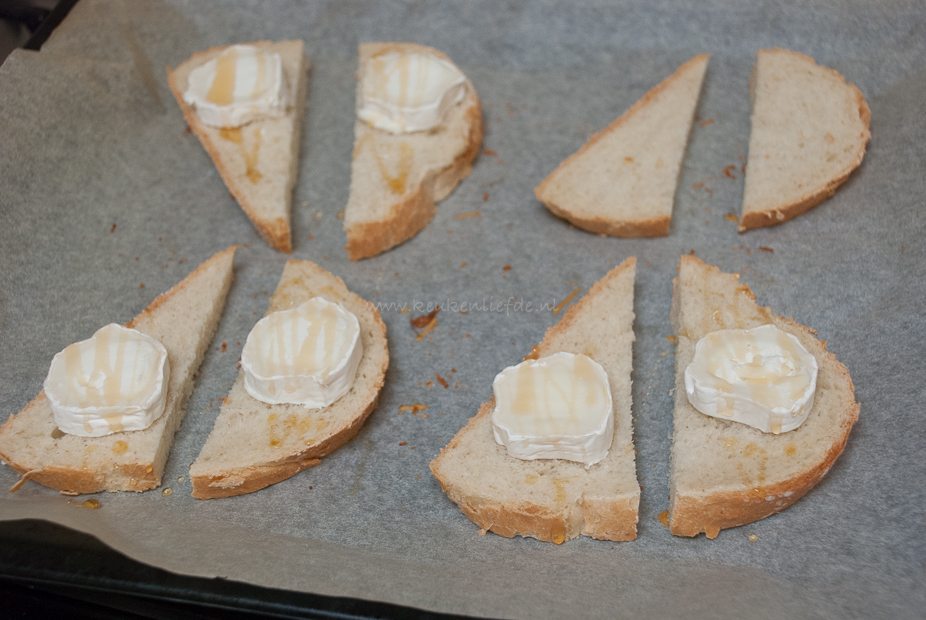 Verwarm de oven voor op 200 graden. Snijd het brood diagonaal doormidden en leg op elk stukje brood een plak geitenkaas. Leg op een met bakpapier bekleed bakblik en druppel wat honing over de geitenkaas. Bak circa 8 minuten in de oven, of totdat het brood licht goudbruin is.