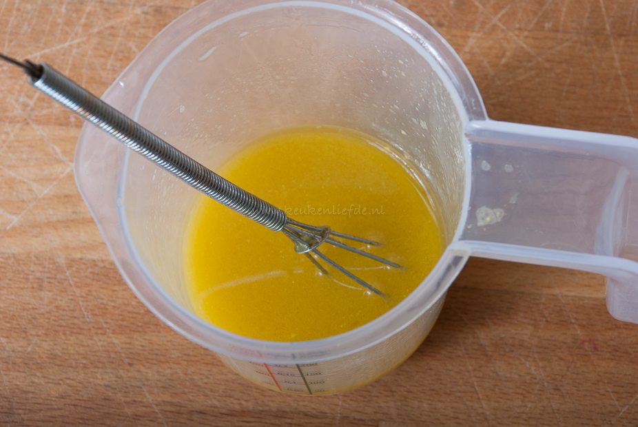 Klop de ingrediënten (behalve de olie) voor de vinaigrette door elkaar, totdat ze goed gemengd zijn en voeg dan langzaam en al kloppend net zoveel olie toe, totdat je een mooie dressing hebt die licht gebonden is. Voeg naar eigen smaak eventueel wat extra azijn, mosterd of honing toe.