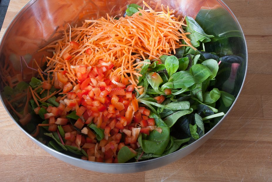 Meng de sla met de wortel en paprika en maak aan met wat vinaigrette, hou wat vinaigrette achter voor garnering. Breng op smaak met peper en zout.