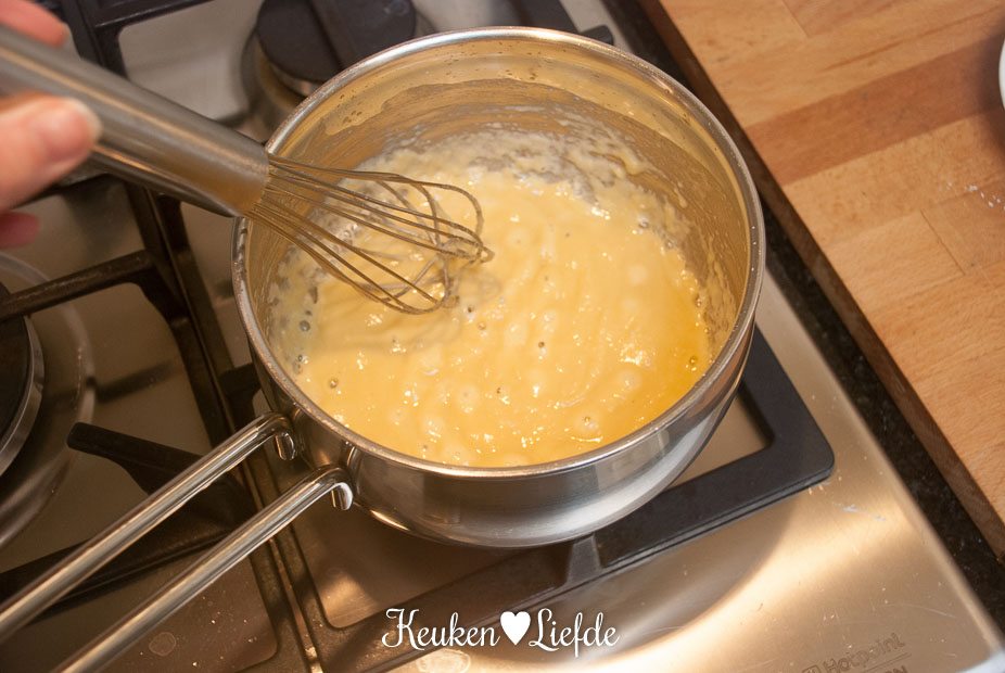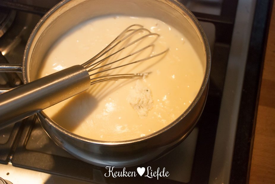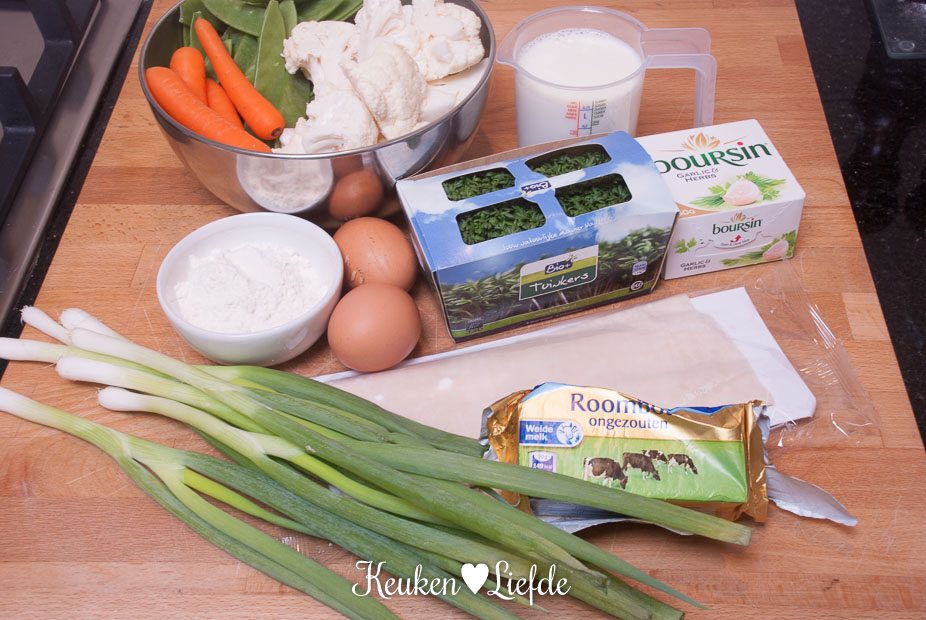 Laat ondertussen op laag vuur de overige roomboter smelten en voeg de bloem toe. Roer een minuut met de garde goed door om de bloem te laten garen. Voeg al roerend de melk en 250 ml van het groentenat toe en zet het vuur wat hoger. Blijf goed roeren met de garde, totdat de saus begint te binden. Voeg de overige Boursin toe en laat de saus enkele minuten op laag vuur zachtjes pruttelen. Houd de saus op laag vuur warm. Roer vlak voor serveren de achtergehouden lente-ui erdoor.