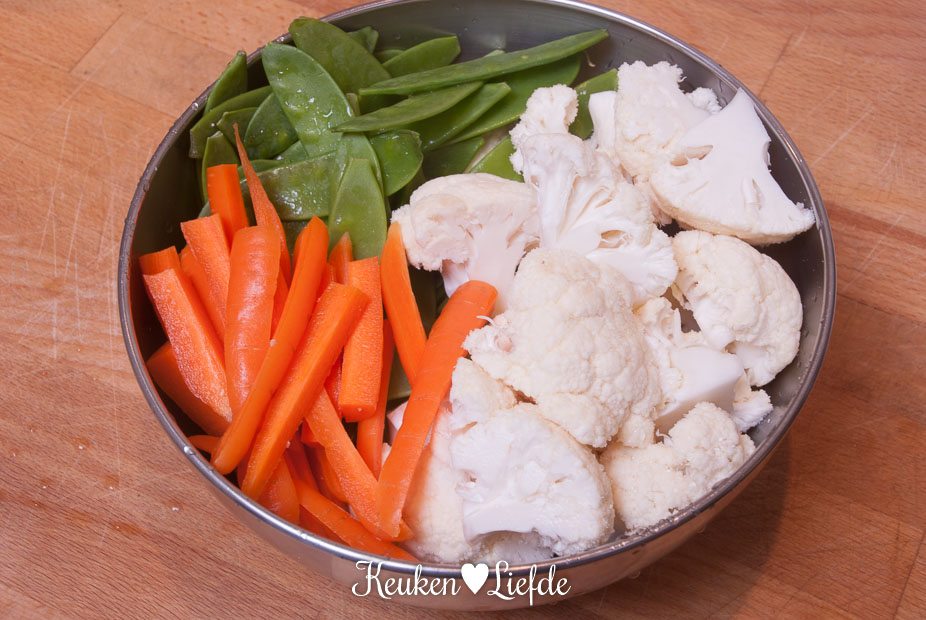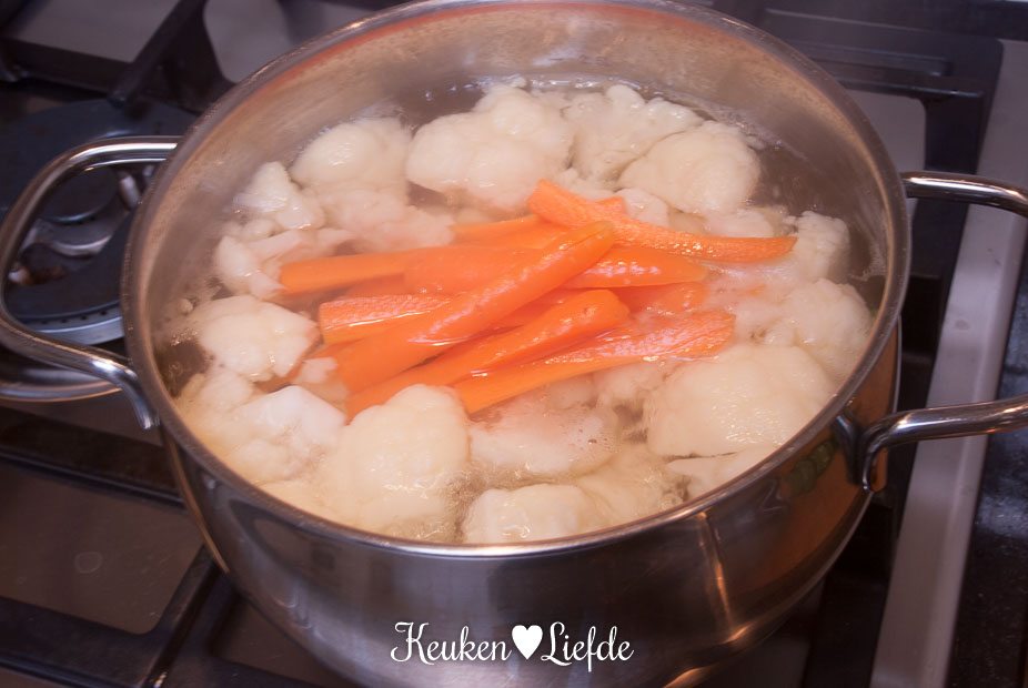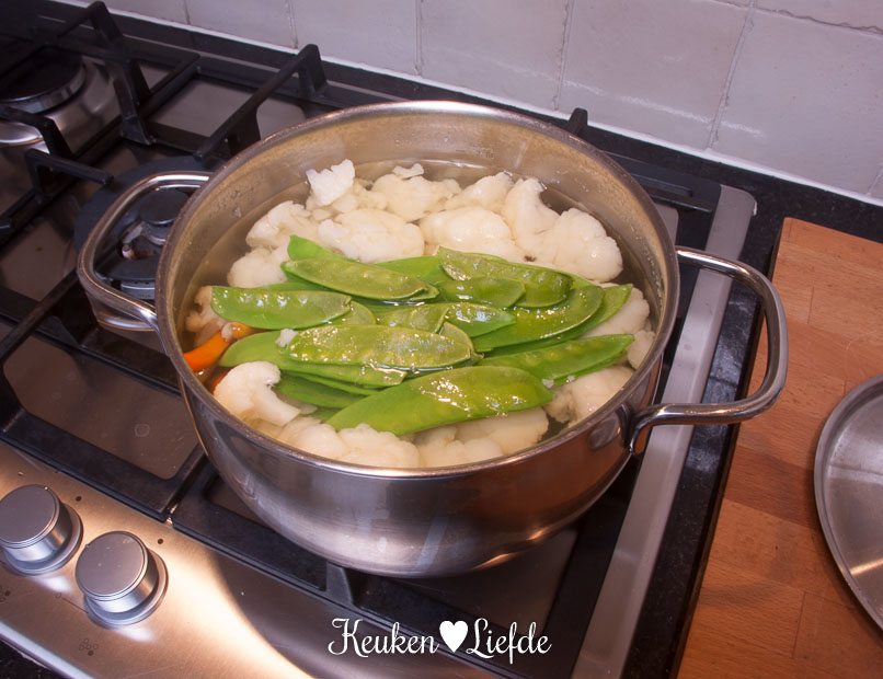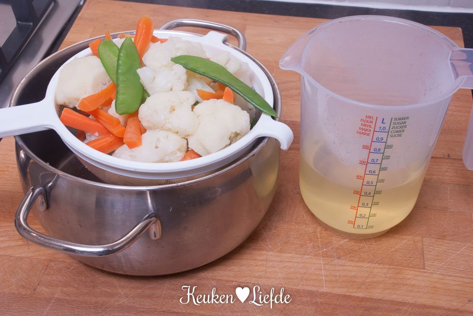 Breng een ruime pan met licht gezouten water aan de kook en voeg de bloemkool toe. Kook 4 minuten en voeg dan de wortel toe. Voeg na 4 minuten de peultjes toe en kook nog 1 minuut verder. Giet de groenten af en vang 250 ml van het kookvocht op. Laat de groenten goed uitlekken in een zeef of vergiet.