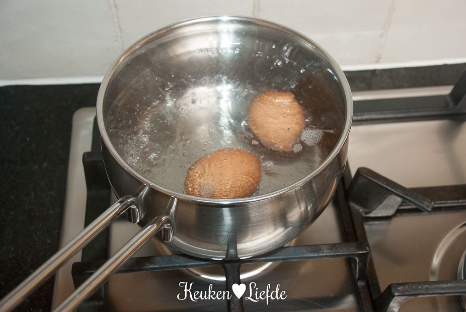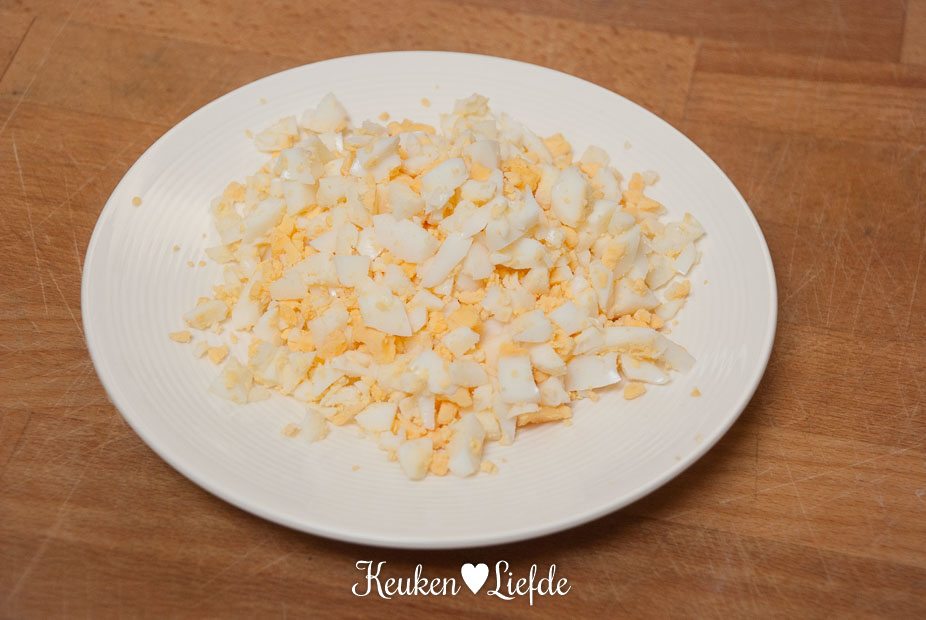 Kook ondertussen in een ander pannetje de eieren hard, circa 8 minuten in kokend water. Giet ze af, spoel af met koud water en pel ze. Hak de eieren grof en dek ze zolang af met vershoudfolie.