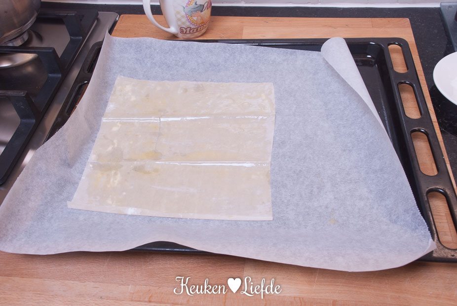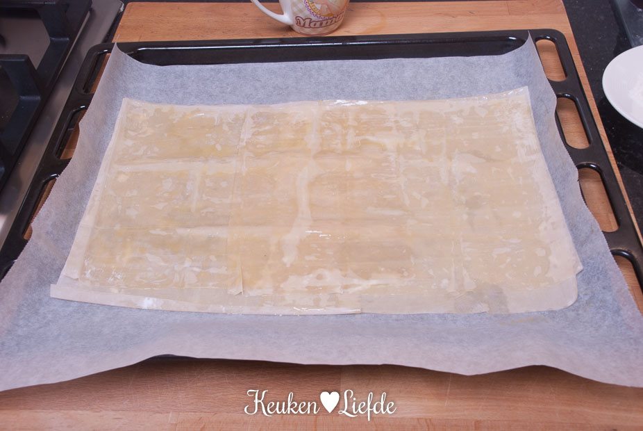 Bekleed een bakblik met een vel bakpapier en leg hier overlappend de plakken filodeeg uit de eerste verpakking op. Bestrijk elke plak filodeeg met een beetje boter, voordat je de andere erop legt. Maak er een langwerpig vierkant van.
