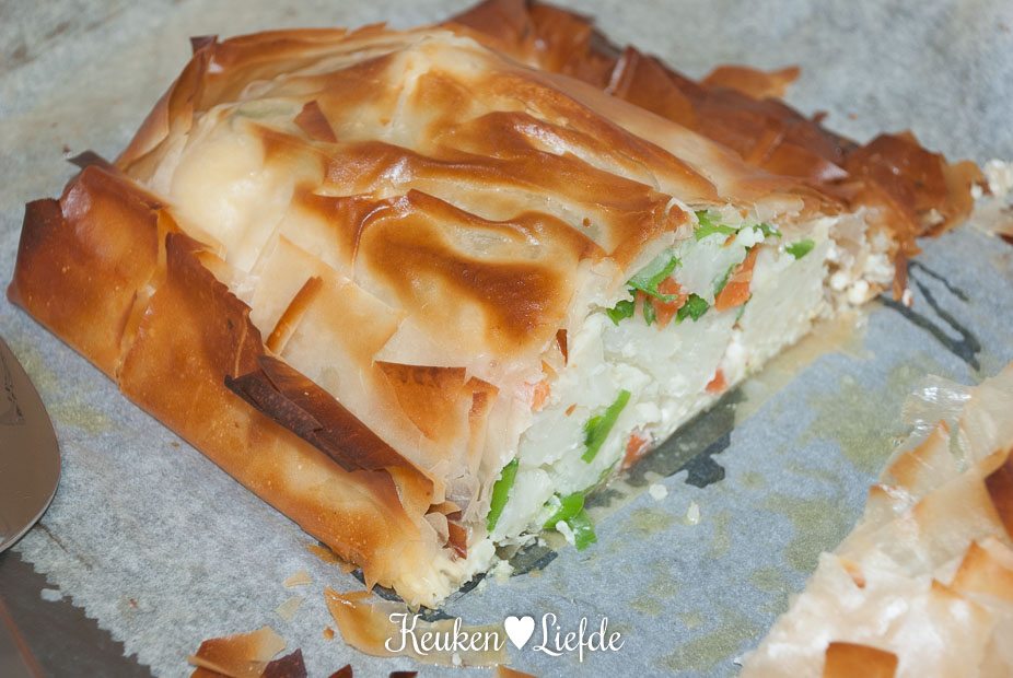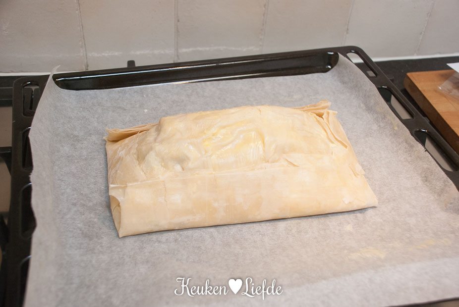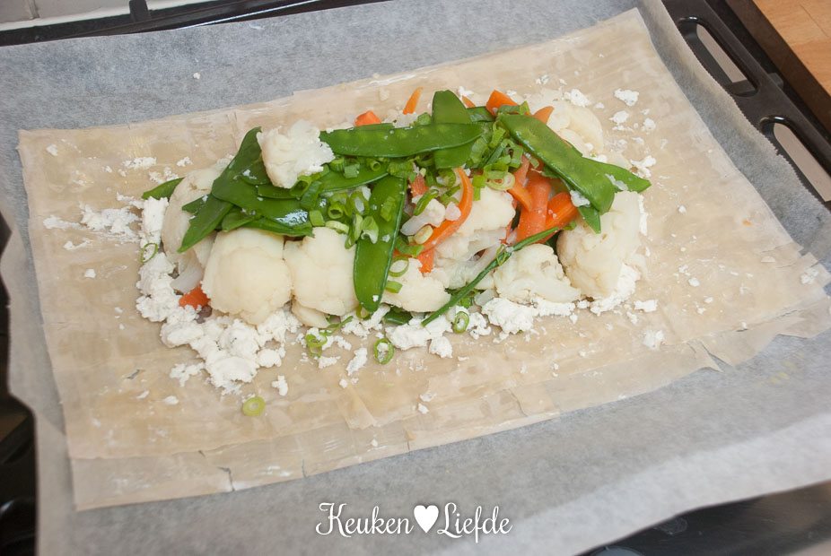 Verkruimel 2/3 van de Boursin over het filodeeg (randen vrijhouden) en leg de groenten in het midden (houd 1 el lente-ui achter de hand). Dek de groenten af met het filodeeg uit het andere pak, op dezelfde manier als de eerste keer. Vouw de randen om, zodat een stevig pakketje ontstaat.