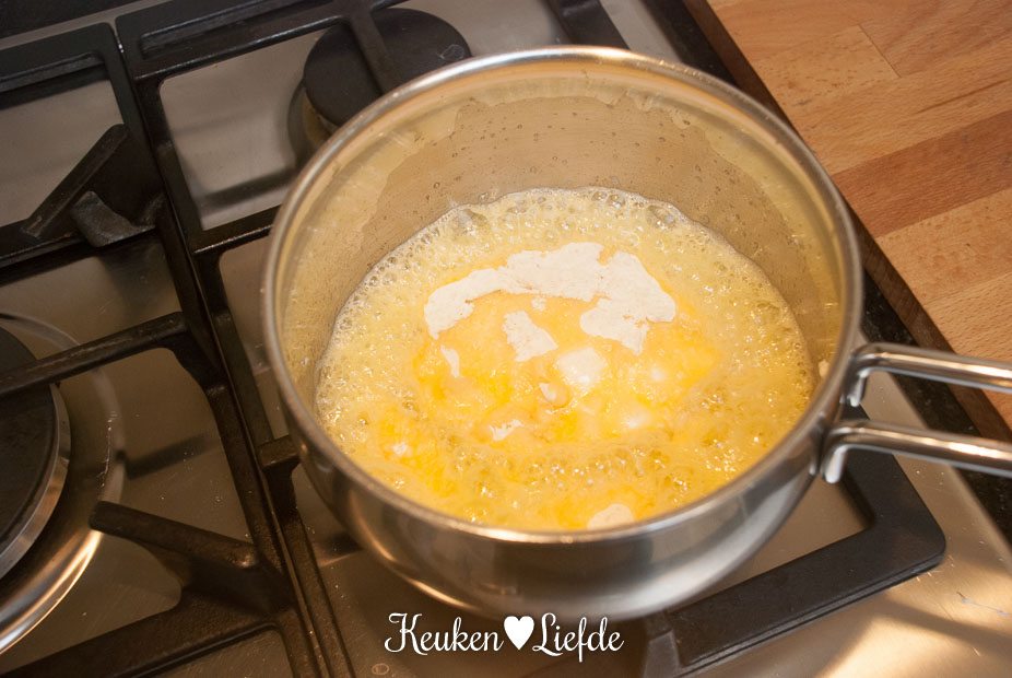 Verwarm de oven voor op 220 graden. Smelt 50 g boter in een steelpannetje of afgedekt in de magnetron.