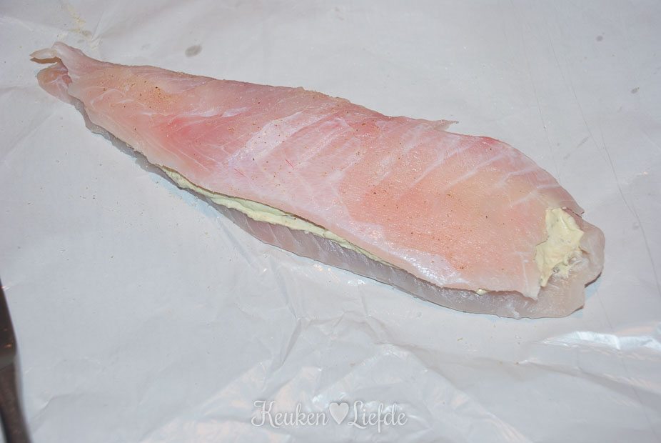 Roer de pesto door de crème fraîche en bestrijk één zijde van de vis royaal met pestocrème (houd 1 eetlepel achter). Gebruik je losse moten vis? Kerf de bovenkant lichtjes in met een scherp mes en wrijf de pestocrème erin. Vouw de vis dicht en omwikkel met Prosciutto.