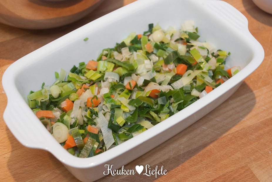 Verdeel de kabeljauw en garnalen in een ovenschaal en bestrooi met wat peterselie, peper en zout. Verdeel dan de groenten erover.