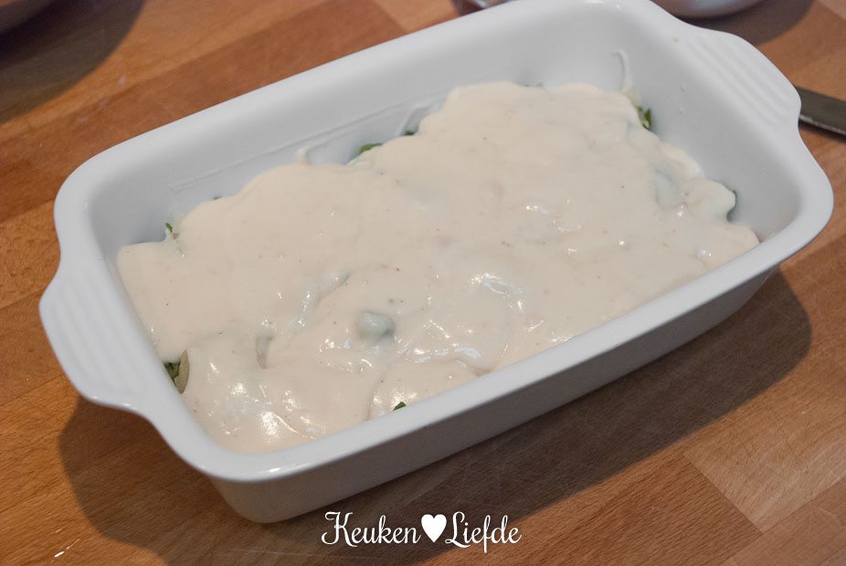 Voeg beetje bij beetje en al roerend de opgevangen bouillon, melk en slagroom toe, totdat je een gladde saus hebt. Breng op smaak met peper en zout.