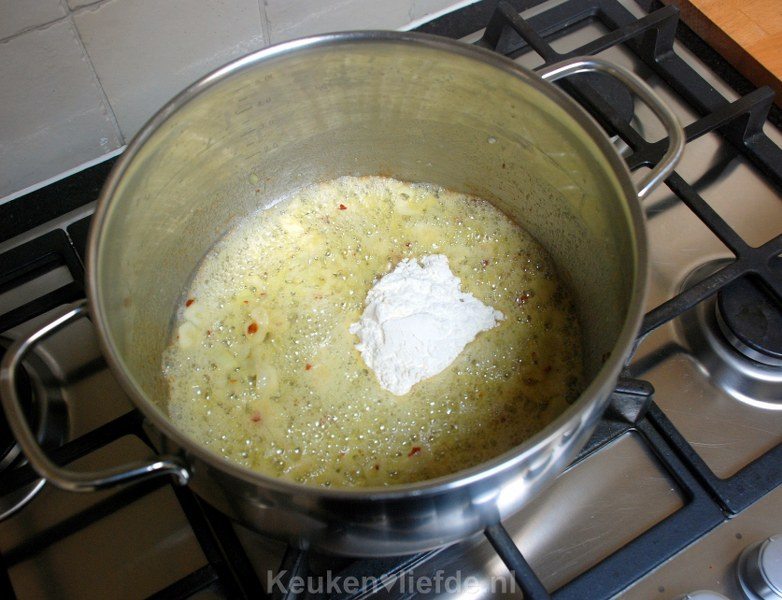 Verhit de boter in een ruime kookpan en fruit de gesnipperde ui, knoflook en chilivlokken hierin, totdat de ui zacht is. Roer de bloem erdoor en gaar even mee.