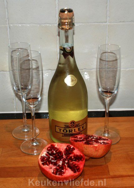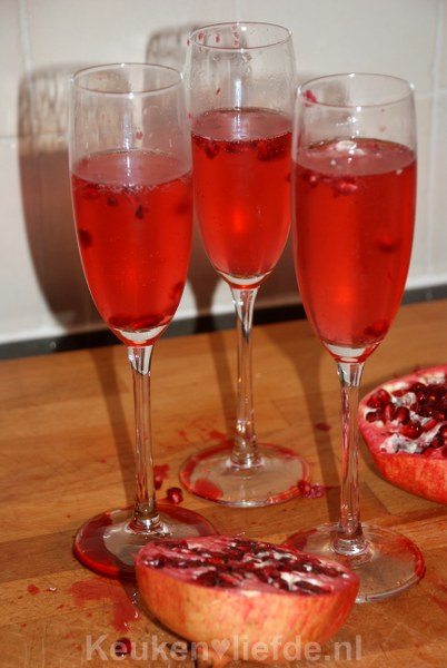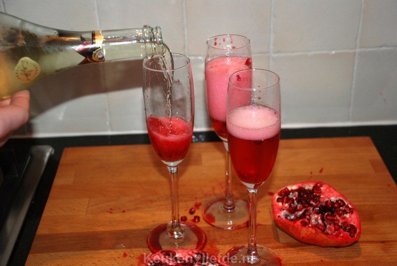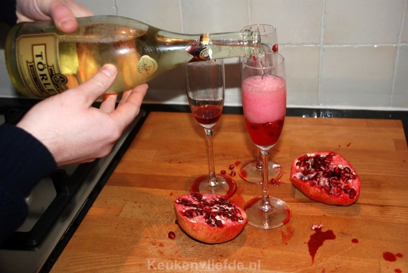 Snijd de granaatappel doormidden en knijp hem uit boven de champagneglazen. Sla eventueel met je hand op de bovenkant van de granaatappel om de pitjes eruit te krijgen. Vul ieder glas voor een kwart met het sap en de pitjes. Schenk de sekt of champagne eroverheen en serveer direct.