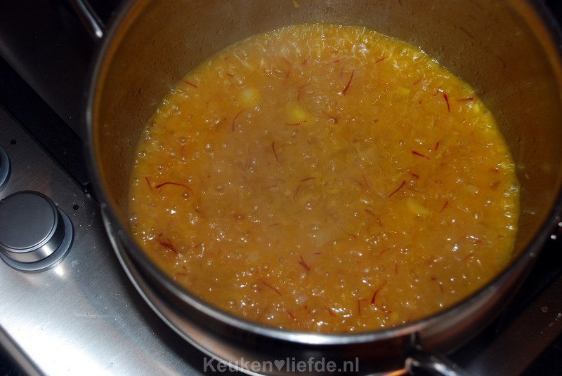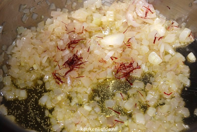 Pel en snipper de sjalotten. Verhit de olijfolie in een pan en fruit de sjalotten glazig. Voeg de saffraan toe en laat 10 seconden fruiten.