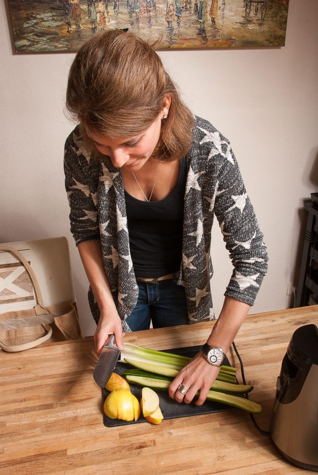 Snijd de bleekselderij in stukken (de schil van bleekselderij bestaat uit stugge draden die moeilijk zijn af te breken). Stop alle ingrediënten door de vulopening en pers ze uit.
