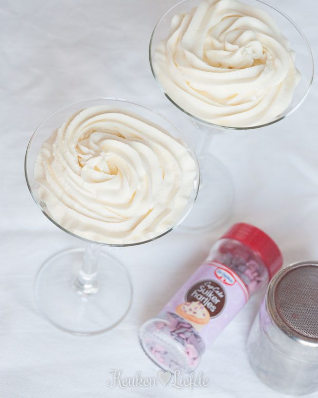 Roer in een ruime kom de mascarpone, yoghurt, poedersuiker en 1 tot 2 el Licor 43 door elkaar tot een gladde mousse. Verdeel de mousse over de 6 glaasjes en zet ze minimaal een uur tot maximaal een nacht in de koelkast. (Wil je net als ik een patroon in de mousse, laat hem dan eerst apart in de koelkast opstijven. Doe de mousse dan in een spuitzak en spuit de glaasjes vol.)