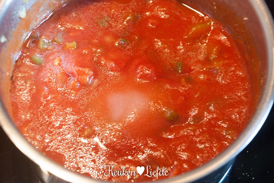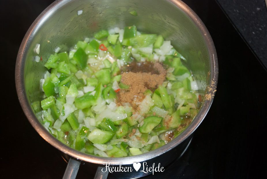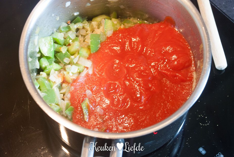 Verhit de olie in een ruime pan en fruit de ui, paprika, peper en knoflook, totdat ze zacht maar niet bruin zijn. Voeg de kruiden toe en bak kort even mee. Voeg de gezeefde tomaten, azijn en suiker toe en roer goed door.