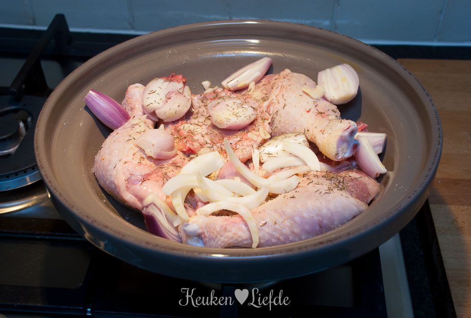 Doe de deksel op de pan en stoof de kip in circa 2 uur langzaam gaar (de kip is goed als het makkelijk van het bot loslaat, maar nog wel sappig en mals is).