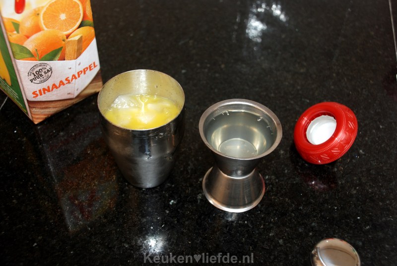 Meet in het bijbehorende maatbekertje van de cocktailshaker 2 delen sinaasappelsap met 1 deel tequila af en mix dit samen met wat ijs in de shaker totdat alles goed koud is.