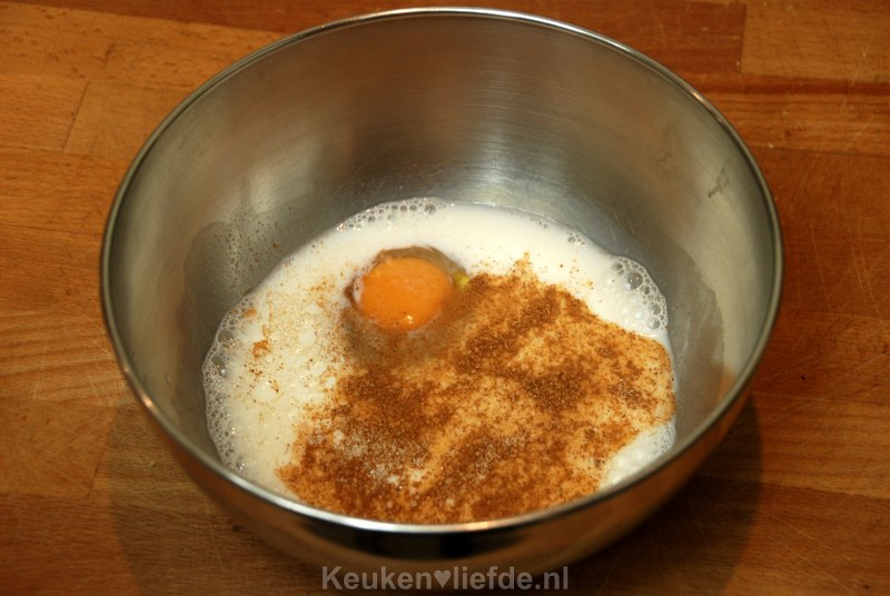 Klop het ei, melk, kaneelpoeder en suiker los in een kom en wentel het brood door dit mengsel.
