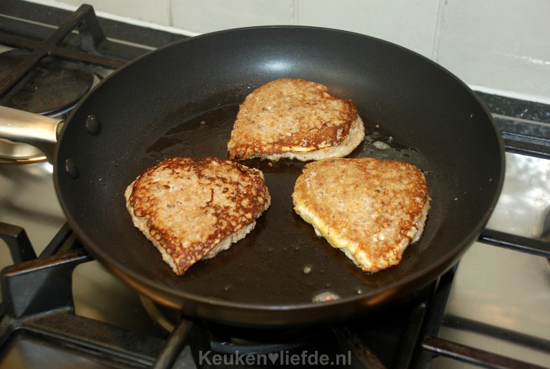 Verhit de koekenpan met wat boter en bak de wentelteefjes op middelhoog vuur, aan beide kanten goudbruin.