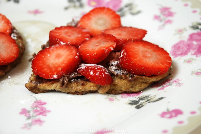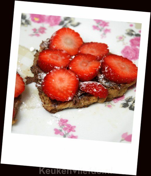 Leg de wentelteefjes op een bord en laat ze iets afkoelen. Besmeer ze met Nutella en beleg met de aardbeien. Bestrooi tot slot met wat poedersuiker en serveer direct.