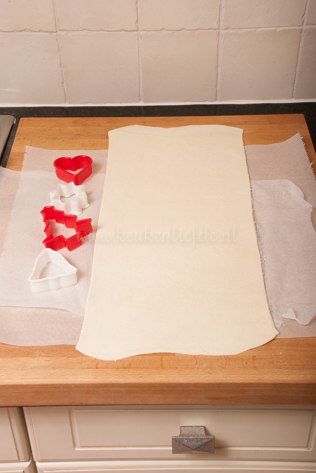 2 vellen bakpapier, deegroller, kwastje, kerstkoekvormpjes om uit te steken, koekenpan, 4 diepe borden