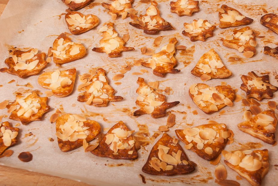 Verwarm de oven voor op 200 graden. Bestrooi de helft van het bladerdeeg met 1 el suiker en vouw het bladerdeeg dubbel. Bestrooi de bovenkant van het deeg met de overige suiker en rol het deeg uit tot een langwerpige plak. Steek met de kerstvormpjes koekjes uit het deeg en prik gaatjes in de koekjes met een vork. Leg de koekjes op een met bakpapier bekleed bakblik en dek af met een tweede vel bakpapier en een bakblik (ik heb maar één bakblik dus gebruikte hier ovenschaaltjes voor). Bak 10 minuten in de oven en verwijder dan het bakblik en bovenste vel bakpapier. Bestrijk de koekjes met losgeklopt ei en bestrooi met de amandelen. Bak nog 5 tot 10 minuten verder, of totdat de koekjes goudbruin zijn. Wil je de koekjes bewaren om later te gebruiken, bak ze dan wat korter in de oven, laat ze volledig afkoelen en bewaar daarna in een luchtdichte zak.
