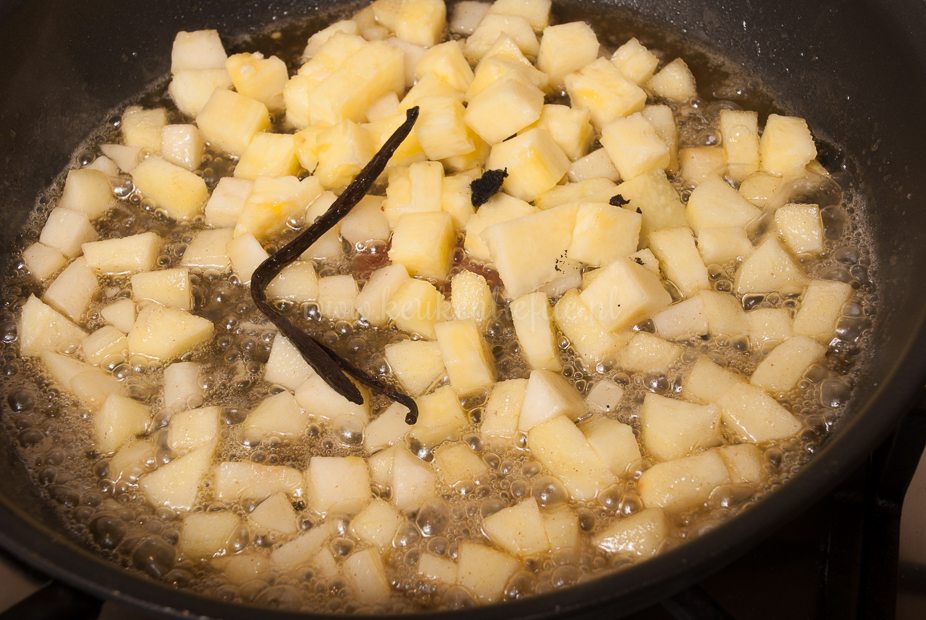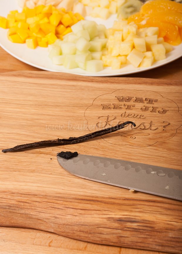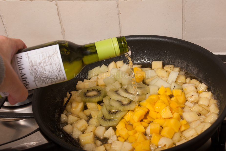 Maak het fruit schoon. Schil de appel, peer, mango, ananas en meloen in kleine blokjes, de sinaasappel in partjes en de kiwi in plakjes. Smelt de boter in de koekenpan. Voeg de suiker toe. Voeg de appel, peer en honing toe en bak 3 minuten. Voeg de ananas toe en bak 1 minuut verder. Schraap intussen met een scherp mes het merg uit het vanillestokje. Voeg het vanillemerg met het opengesneden vanillestokje toe. Voeg vervolgens de kiwi, mango en meloen en bak nog 1 minuut verder. Besprenkel het fruit met de wijn. Neem de pan eventueel van het vuur en bewaar het fruit tot serveren.