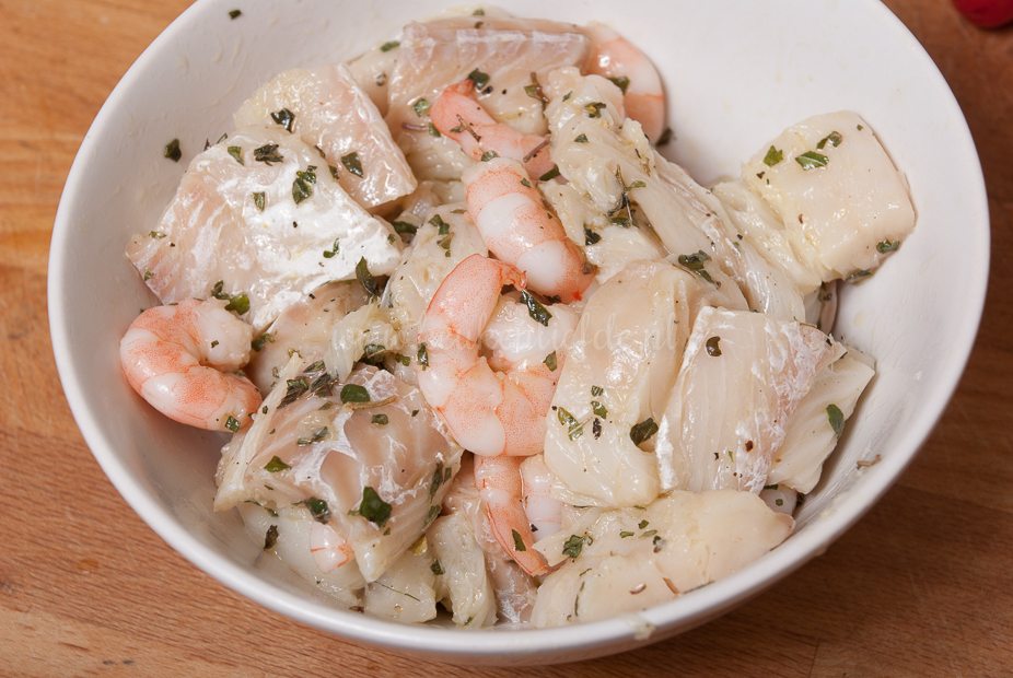 Snijd de visfilet in middelgrote stukken en hussel samen met de garnalen om met de oregano, een kneep citroensap, een scheut olijfolie, en wat versgemalen peper. Laat even marineren.