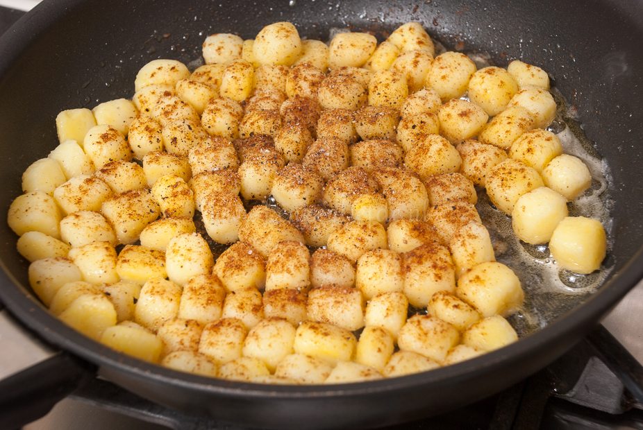 Bak ondertussen de krieltjes met paprikapoeder in een koekenpan met boter of olie gaar en goudbruin. Breng op smaak met peper en zout.