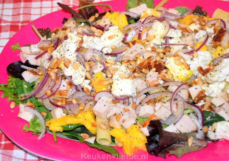 Heb je nog een restje gebraden kip (of ander gebraden vlees) in de koelkast liggen? Maak deze heerlijke pastasalade met mango en gebraden kip. Je kunt hem lauwwarm eten als hoofdgerecht, of de volgende dag koud serveren als lunch. Eventueel kun je ook gerookte kip of plakjes kipfilet gebruiken.