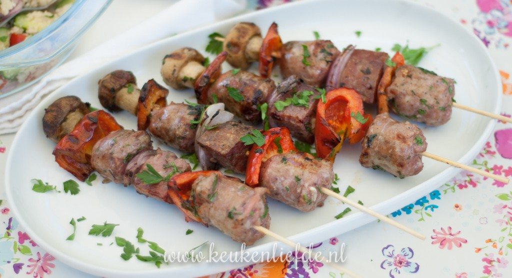 Deze barbecue-worstspiezen maak heel snel en eenvoudig met kant-en-klaar gekruide worstjes. Ik ben dol op pittig gekruide mergeuz-worstjes, maar in principe kun je elke verse worst gebruiken die je maar kunt vinden in de campingwinkel of op de markt, en die jezelf lekker vindt. De in stukken gesneden worst en groenten marineer ik van tevoren in wat knoflook-kruidenolie. Dat geeft een extra lekkere smaak! Lekker om te serveren met deze couscoussalade!