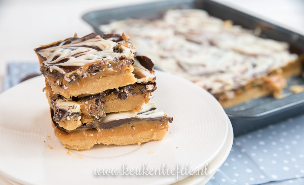 Een kruimelige koekbodem, zachte karamelvulling en knapperig chocolade laagje, dat is de Millionaire’s shortbread! Deze variant heeft een supersnelle bodem van gemalen spritskoekjes die opstijft in de koelkast. Je hebt voor dit recept dus geen oven nodig. Het resultaat is verrukkelijk!