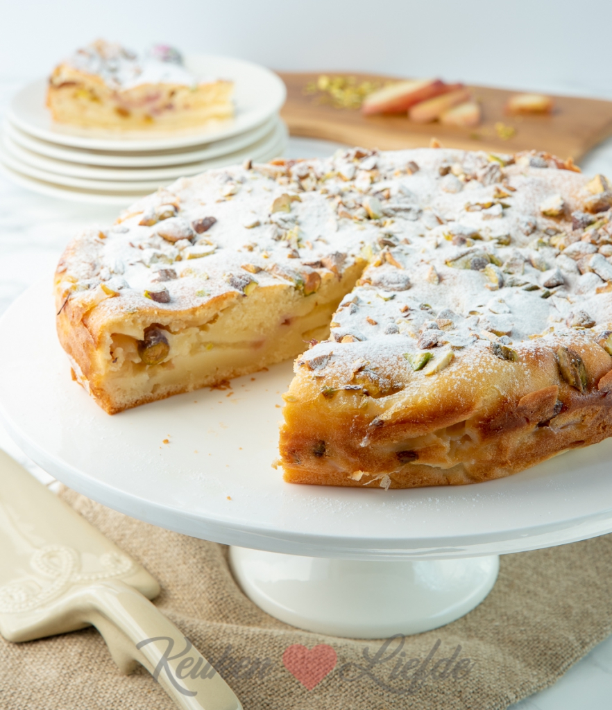 Yoghurttaart met perzik en pistache