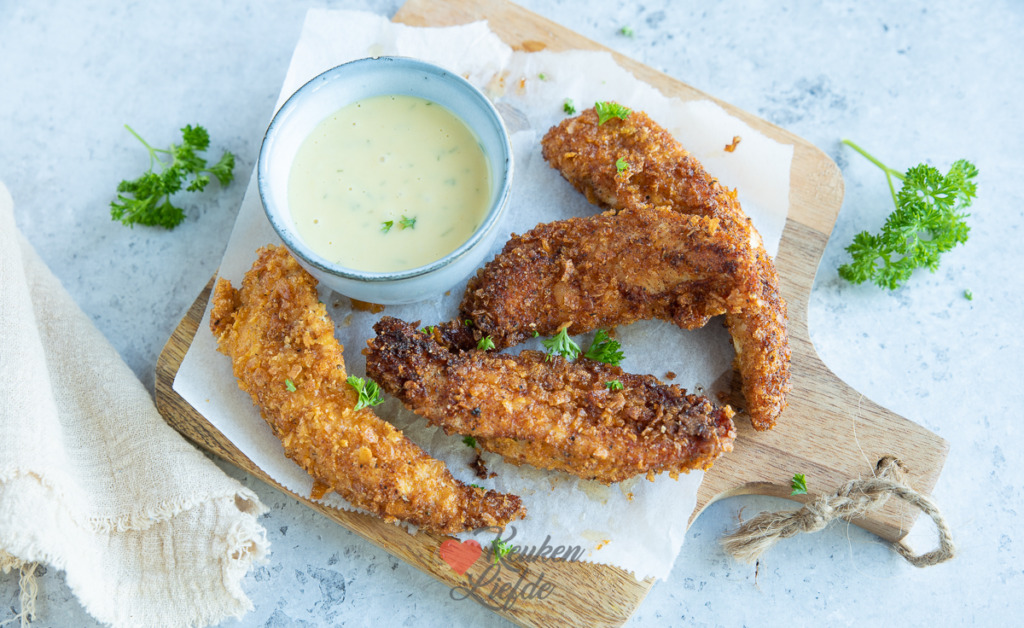 Wees gewaarschuwd: deze chicken tenders met zelfgemaakte honing-mosterdsaus zijn verslavend lekker! Ik bak ze goudbruin en krokant in de koekenpan, maar je kunt ze ook in de oven (ca. 15 minuten op 200 graden), of in de airfryer (ca. 10 minuten op 200 graden) bakken. Lekker op een doordeweekse dag met zelfgemaakte ovenfrietjes en gekookte sperziebonen.