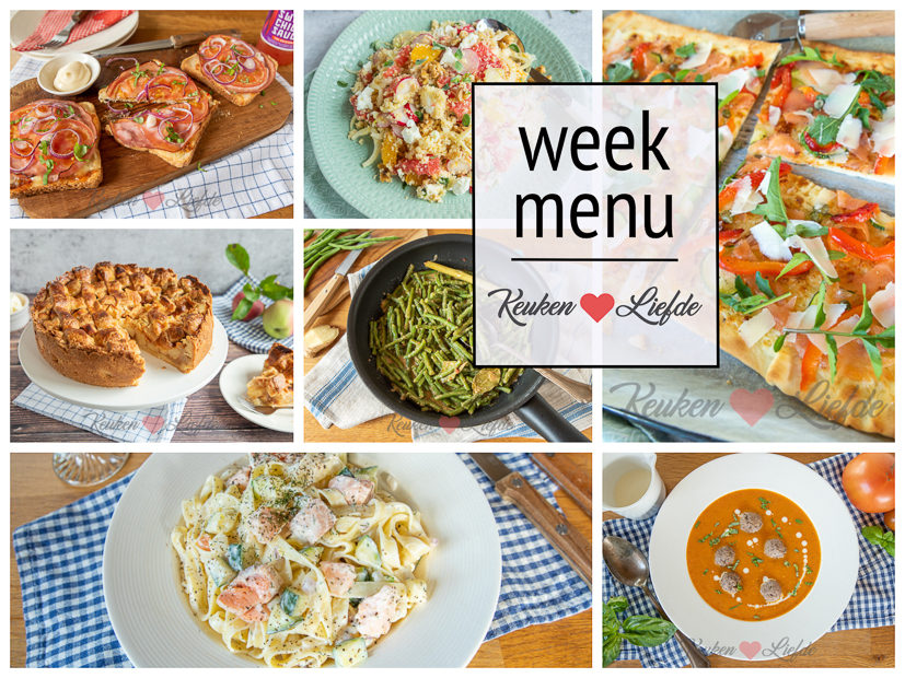 In dit nieuwe weekmenu vind je tagliatelle met zalm, courgette en roomsaus, sambal goreng boontjes met, broodsnacks uit de oven, couscous met citrus, venkel en feta en flammkuchen met zalm, courgette en paprika. In het weekend geniet je verse tomatensoep met gehaktballetjes en een Hollandse appeltaart! Ik wens je een smakelijke week toe!