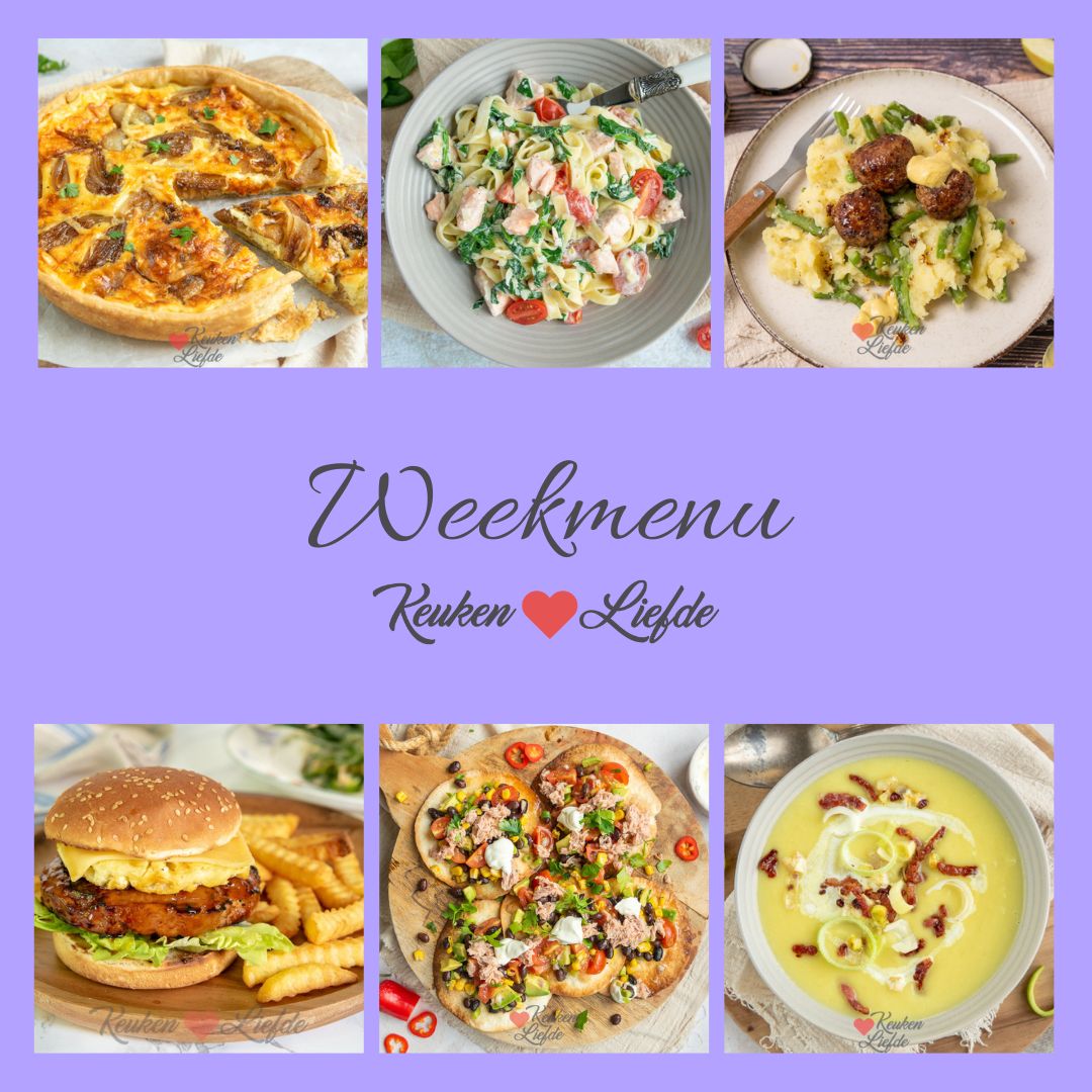 Een weekmenu is een handige en leuke manier om alvast te bedenken wat je de hele week gaat eten. Omdat er bij de meeste mensen vaak één dag in de week is waarop je niet kookt — omdat er bijvoorbeeld kliekjes zijn, of omdat je zin hebt in een frietje of iets anders — deel ik in dit weekmenu 6 hoofdgerechten. Op zondag deel ik een lekker toetje of zoet baksel met je.