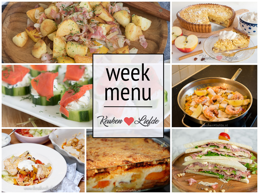 In dit weekmenu vind je onder andere een recept voor de perfect gebakken aardappels, makkelijke paella met vis, een sandwich met truffelmayonaise, gezonde kapsalon, lasagne met pompoen en pastinaak, een lekker komkommerhapje met zalm en roomkaas en een zelfgemaakte appelkruimelvlaai! Elke dag wat anders, zo blijft het leuk en lekker!