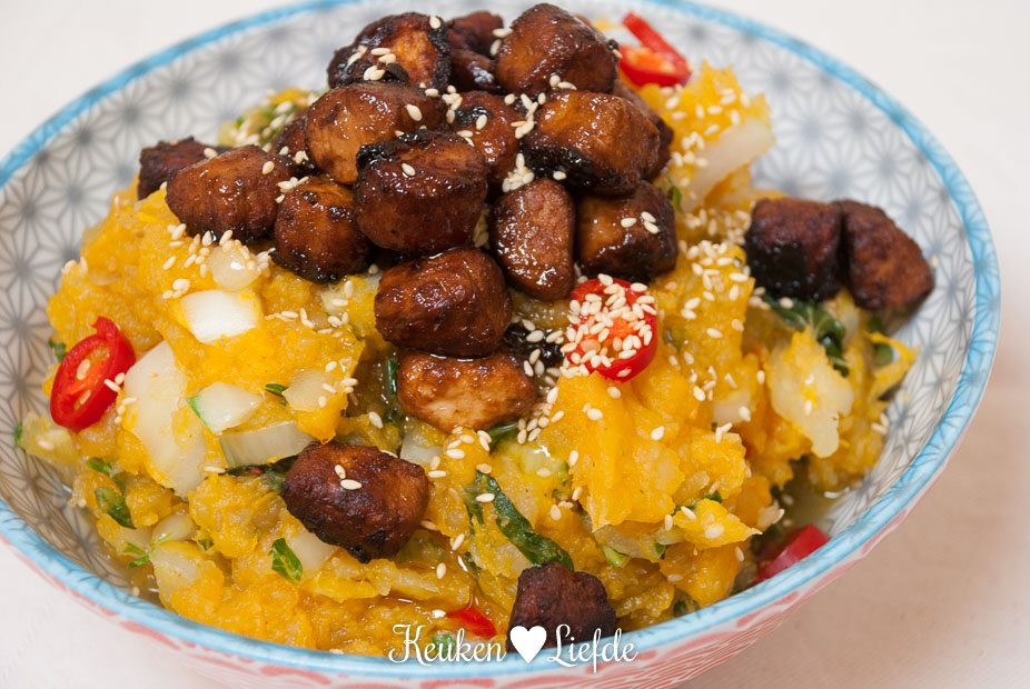 Zoete-aardappelstamppot met vega ketjap filetstukjes