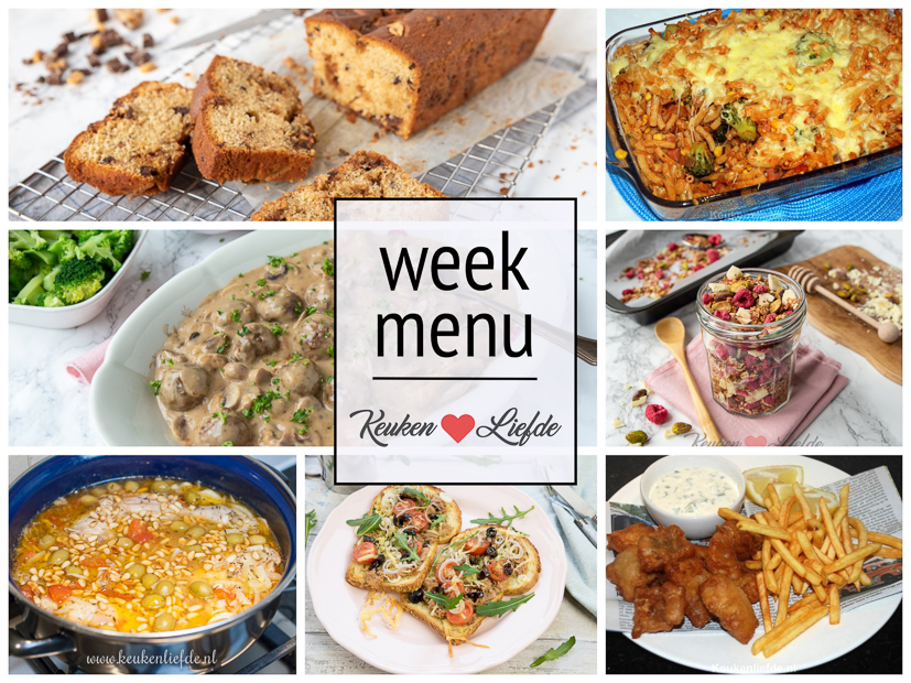 In dit weekmenu: gehaktballetjes in champignonroomsaus, pasta ovenschotel met broccoli, ham en mais, tuna melt tosti, zelfgemaakte Hollandse kibbeling en een Mediterraanse kipstoofschotel met venkel en olijven. In het weekend kun je genieten van zelfgemaakte granola met framboos, pistache en witte chocolade en een heerlijke snickerscake. Elke dag wat anders, zo blijft het leuk en lekker!